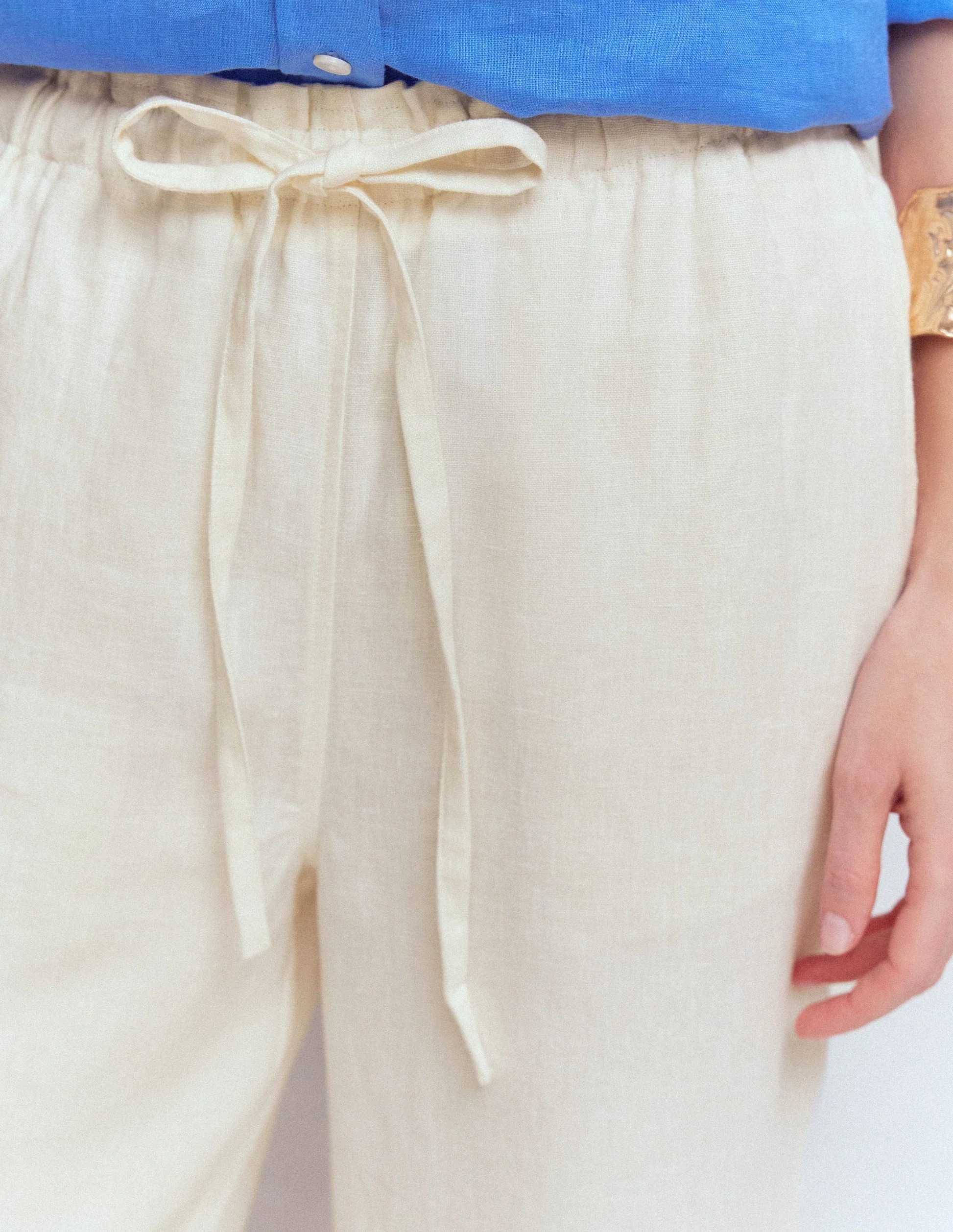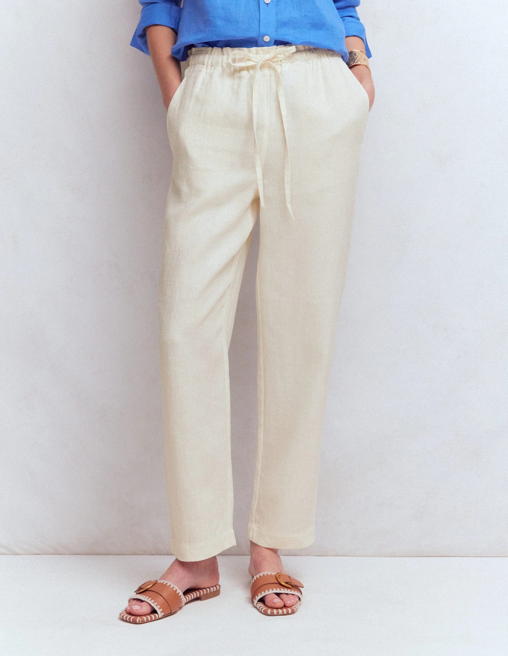 We strive to boost your mood and make your life easier. These cropped trousers will deliver on both. The drawstring waist and breezy pure linen fabric will keep you feeling cool and comfortable whatever the day throws at you. Pull them on, add a vest and a mega-watt smile.